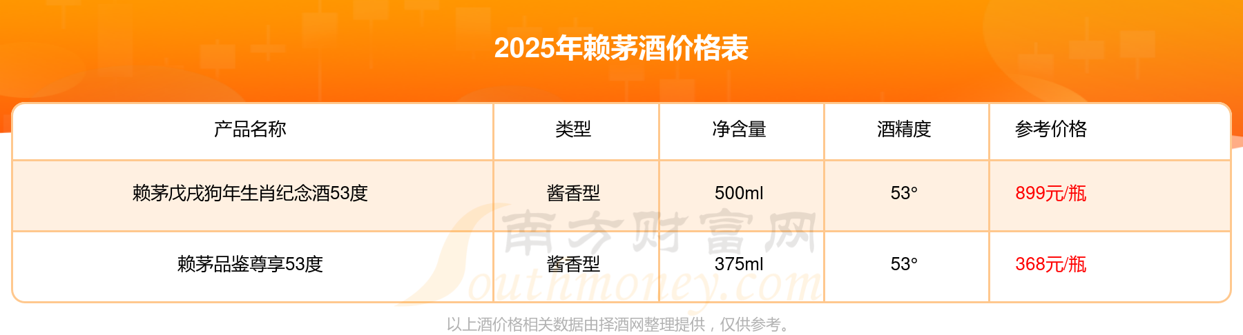 2025年,賴茅戊戌狗年生肖紀(jì)念酒53度、賴茅品鑒尊享53度等賴茅酒價格如下:賴茅戊戌狗年生肖紀(jì)念酒53度參考價899元/瓶、賴茅品鑒尊享53度參考價368元/瓶。