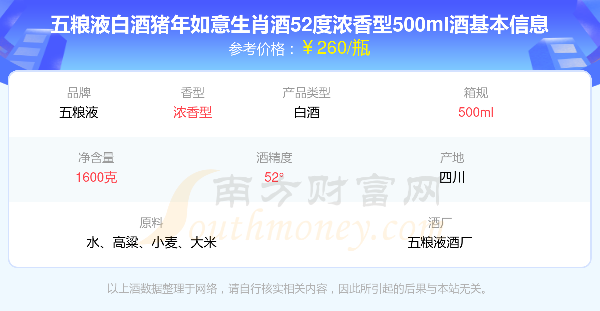 五糧液白酒豬年如意生肖酒52度濃香型500ml基本信息