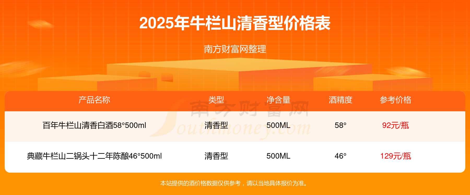2025年,典藏牛欄山二鍋頭十二年陳釀46°500ml、百年牛欄山清香白酒58°500ml等牛欄山清香型酒價格如下:
