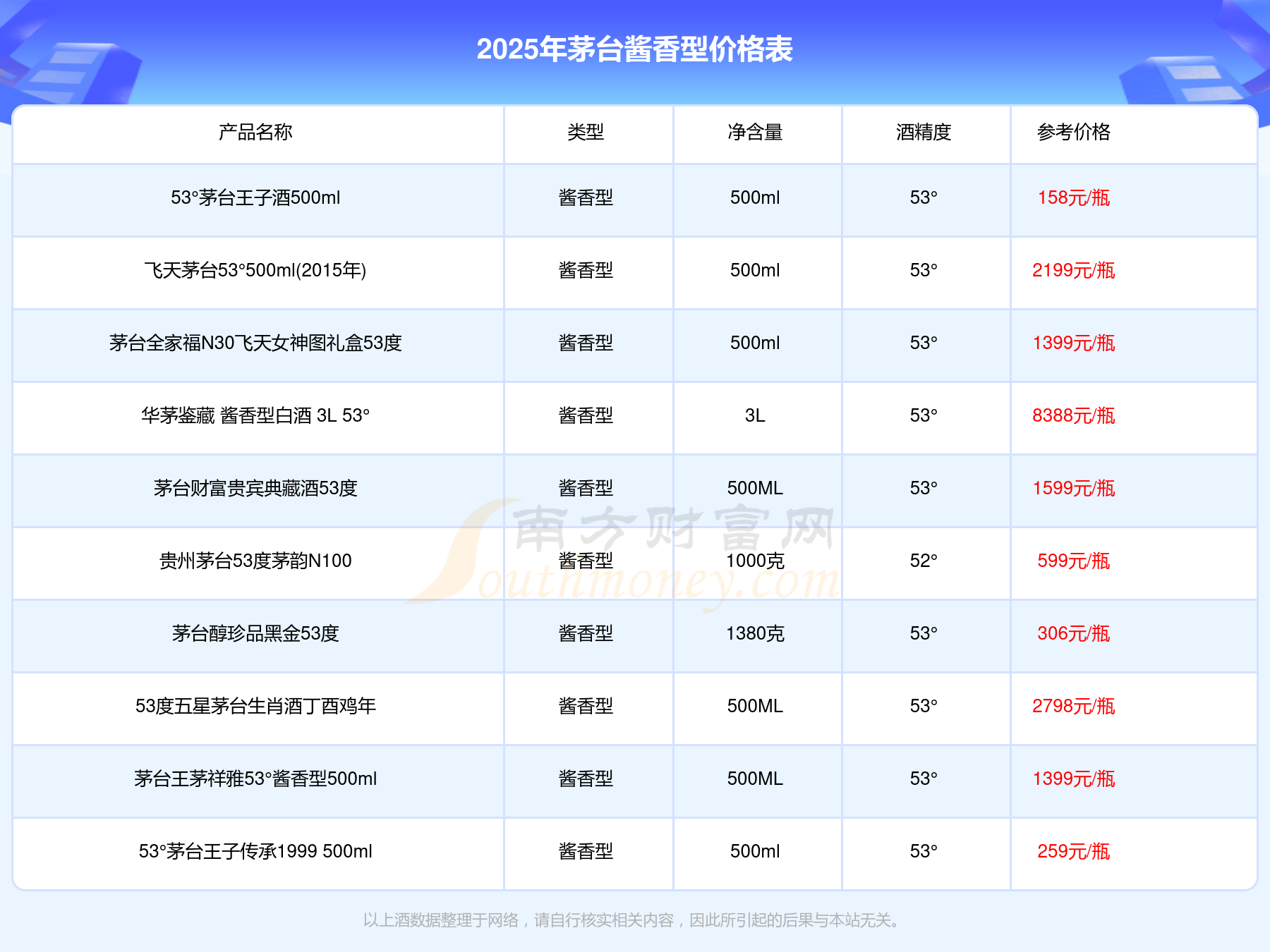 2025年茅臺醬香型酒華茅鑒藏 醬香型白酒 3L 53°、53度五星茅臺生肖酒丁酉雞年、貴州茅臺己亥豬年生肖酒53°500ml等最新價格如下: