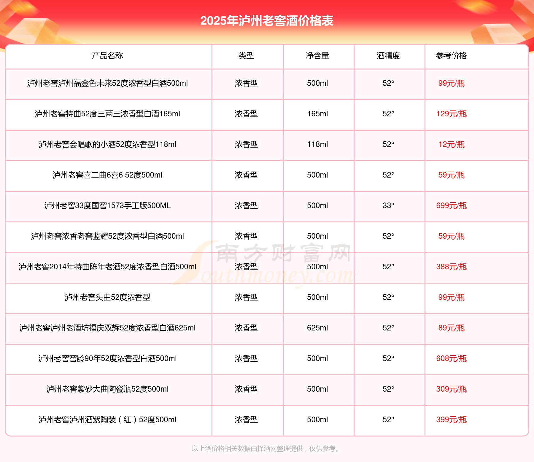 瀘州老窖酒最新價格2025:瀘州老窖國窖1573春釀鼠兆豐年E 55度參考價17999元/瓶、瀘州老窖國窖1573生命中的那壇酒55度014參考價9999元/瓶、瀘州老窖國窖1573春釀鼠兆豐年A 55度參考價5088元/瓶、瀘州老窖國窖1573生命中的那壇酒55度013濃香型白酒1000ml參考價4988元/瓶、瀘州老窖國窖1573生命中的那壇酒55度009 1000ml參考價4288元/瓶、瀘州老窖國窖1573中國品味52度濃香型白酒500ml參考價2888元/瓶。