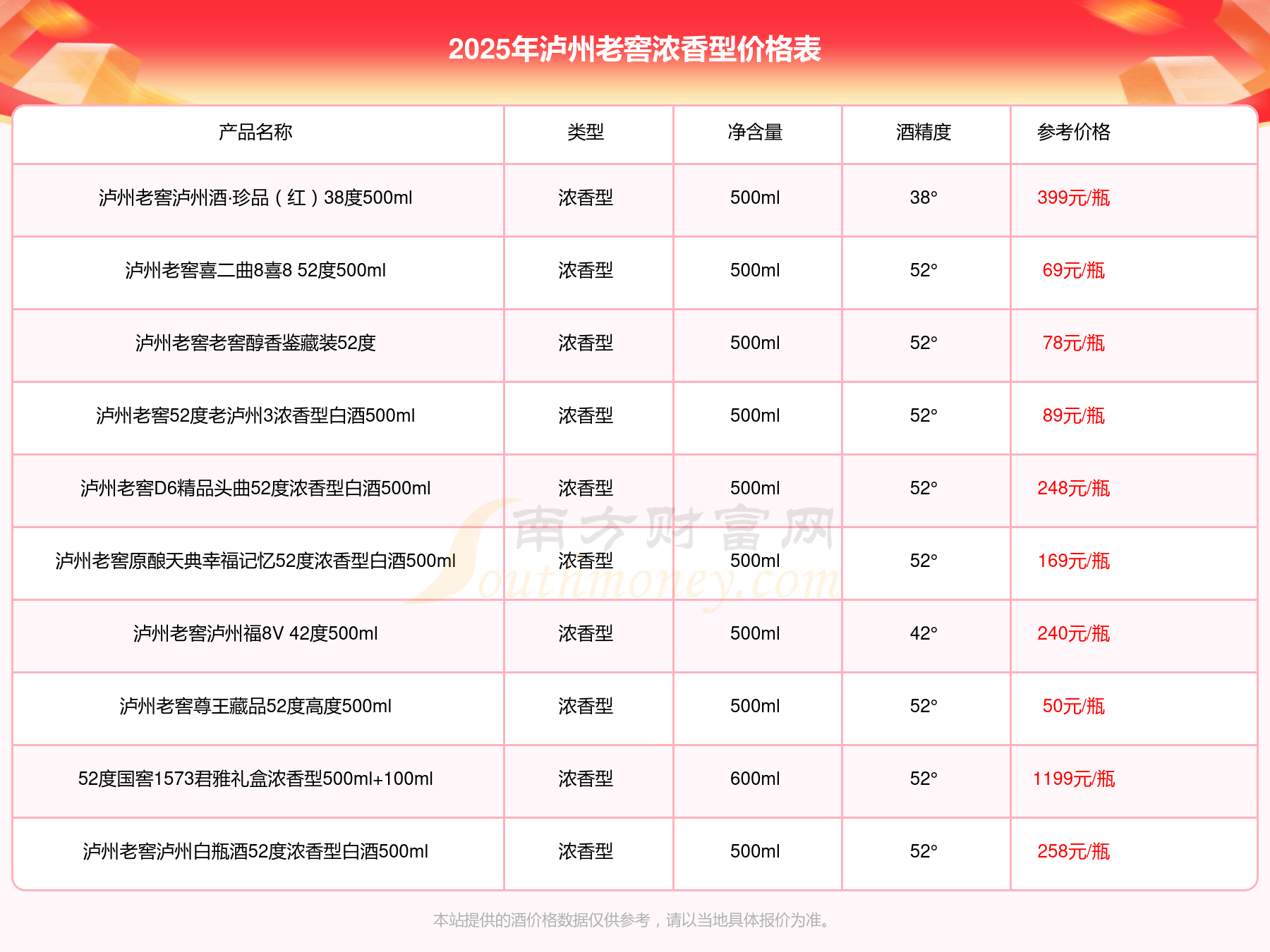 2025年瀘州老窖濃香型酒瀘州老窖國窖1573春釀鼠兆豐年E 55度、瀘州老窖國窖1573生命中的那壇酒55度014、瀘州老窖國窖1573春釀鼠兆豐年A 55度、瀘州老窖國窖1573生命中的那壇酒55度013濃香型白酒1000ml、瀘州老窖國窖1573生命中的那壇酒55度009 1000ml等最新價格如下:瀘州老窖國窖1573春釀鼠兆豐年E 55度參考價17999元/瓶、瀘州老窖國窖1573生命中的那壇酒55度014參考價9999元/瓶、瀘州老窖國窖1573春釀鼠兆豐年A 55度參考價5088元/瓶、瀘州老窖國窖1573生命中的那壇酒55度013濃香型白酒1000ml參考價4988元/瓶、瀘州老窖國窖1573生命中的那壇酒55度009 1000ml參考價4288元/瓶。