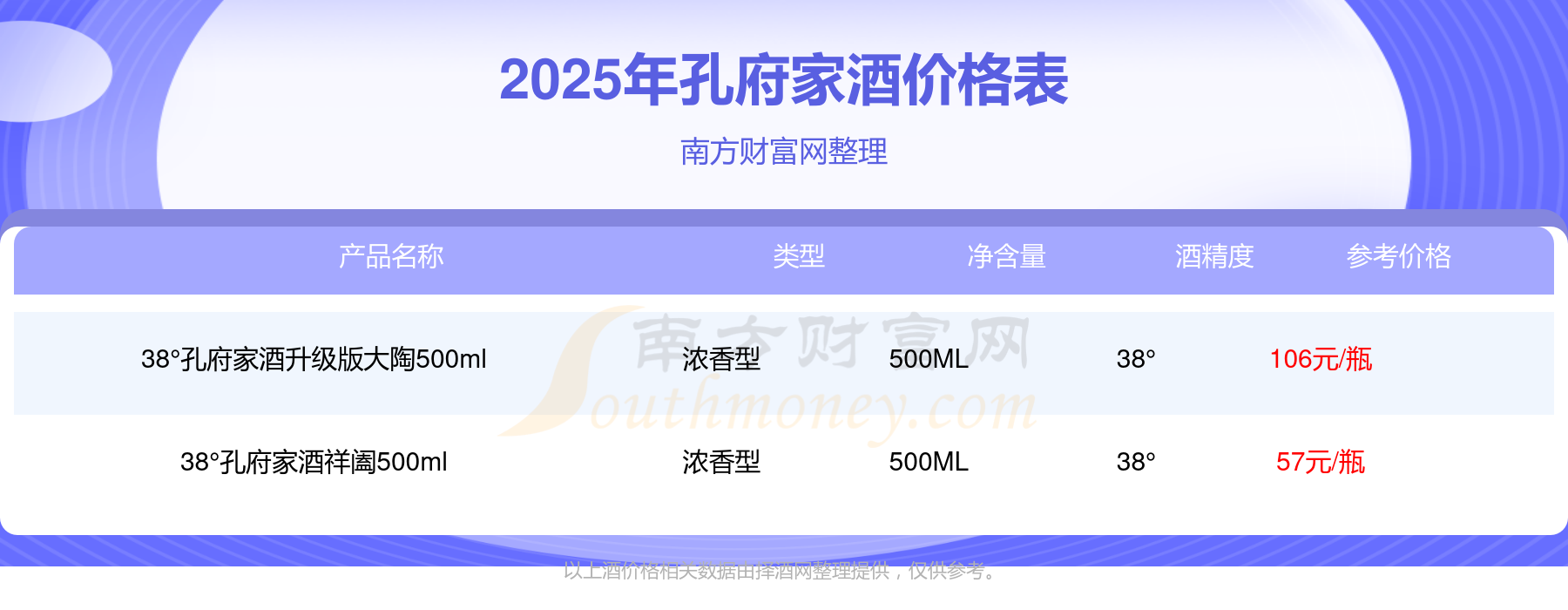 38°孔府家酒升級版大陶500ml參考價106元/瓶、38°孔府家酒祥闔500ml參考價57元/瓶。