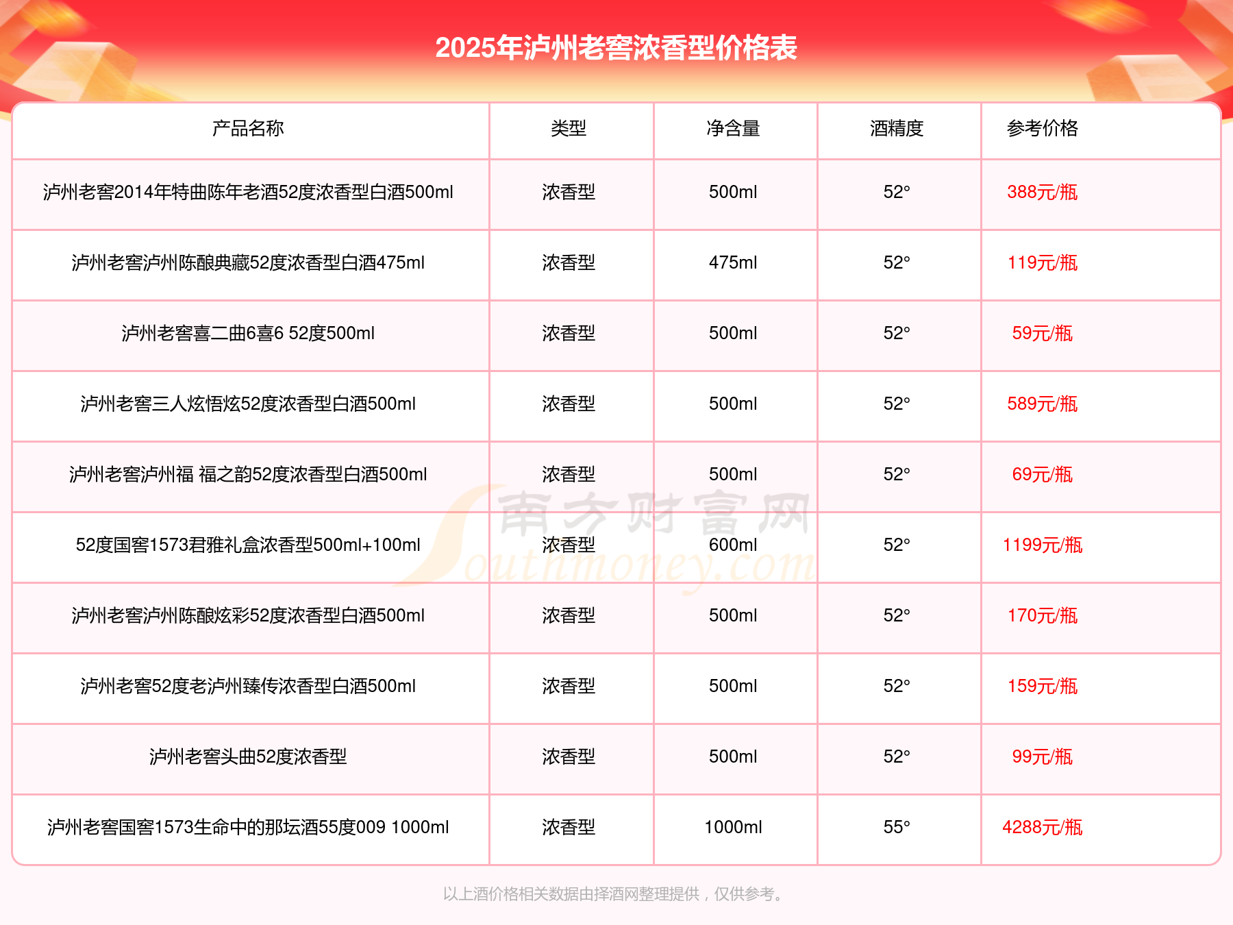2025年瀘州老窖濃香型酒瀘州老窖國窖1573春釀鼠兆豐年E 55度、瀘州老窖國窖1573生命中的那壇酒55度014、瀘州老窖國窖1573春釀鼠兆豐年A 55度、瀘州老窖國窖1573生命中的那壇酒55度013濃香型白酒1000ml、瀘州老窖國窖1573生命中的那壇酒55度009 1000ml、瀘州老窖國窖1573中國品味52度濃香型白酒500ml等最新價(jià)格如下: