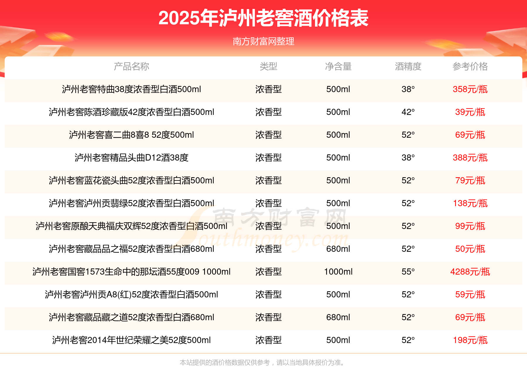 2025瀘州老窖酒最新價(jià)格:瀘州老窖國窖1573春釀鼠兆豐年E 55度參考價(jià)17999元/瓶、瀘州老窖國窖1573生命中的那壇酒55度014參考價(jià)9999元/瓶、瀘州老窖國窖1573春釀鼠兆豐年A 55度參考價(jià)5088元/瓶、瀘州老窖國窖1573生命中的那壇酒55度013濃香型白酒1000ml參考價(jià)4988元/瓶、瀘州老窖國窖1573生命中的那壇酒55度009 1000ml參考價(jià)4288元/瓶、瀘州老窖國窖1573中國品味52度濃香型白酒500ml參考價(jià)2888元/瓶。