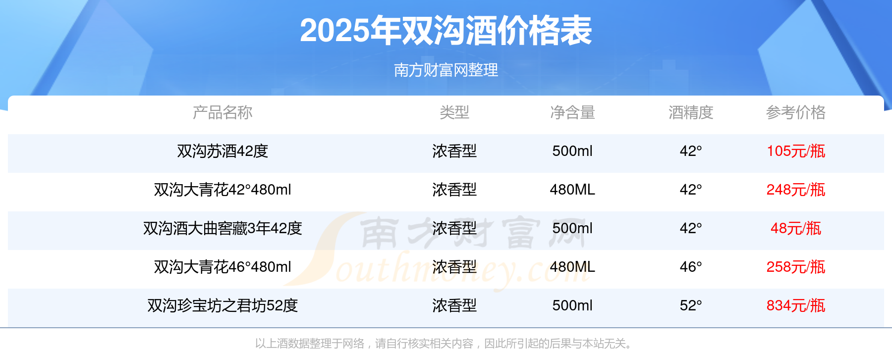 2025年雙溝酒雙溝珍寶坊之君坊52度、雙溝大青花46°480ml、雙溝大青花42°480ml、雙溝蘇酒42度、雙溝酒大曲窖藏3年42度等最新價格如下: