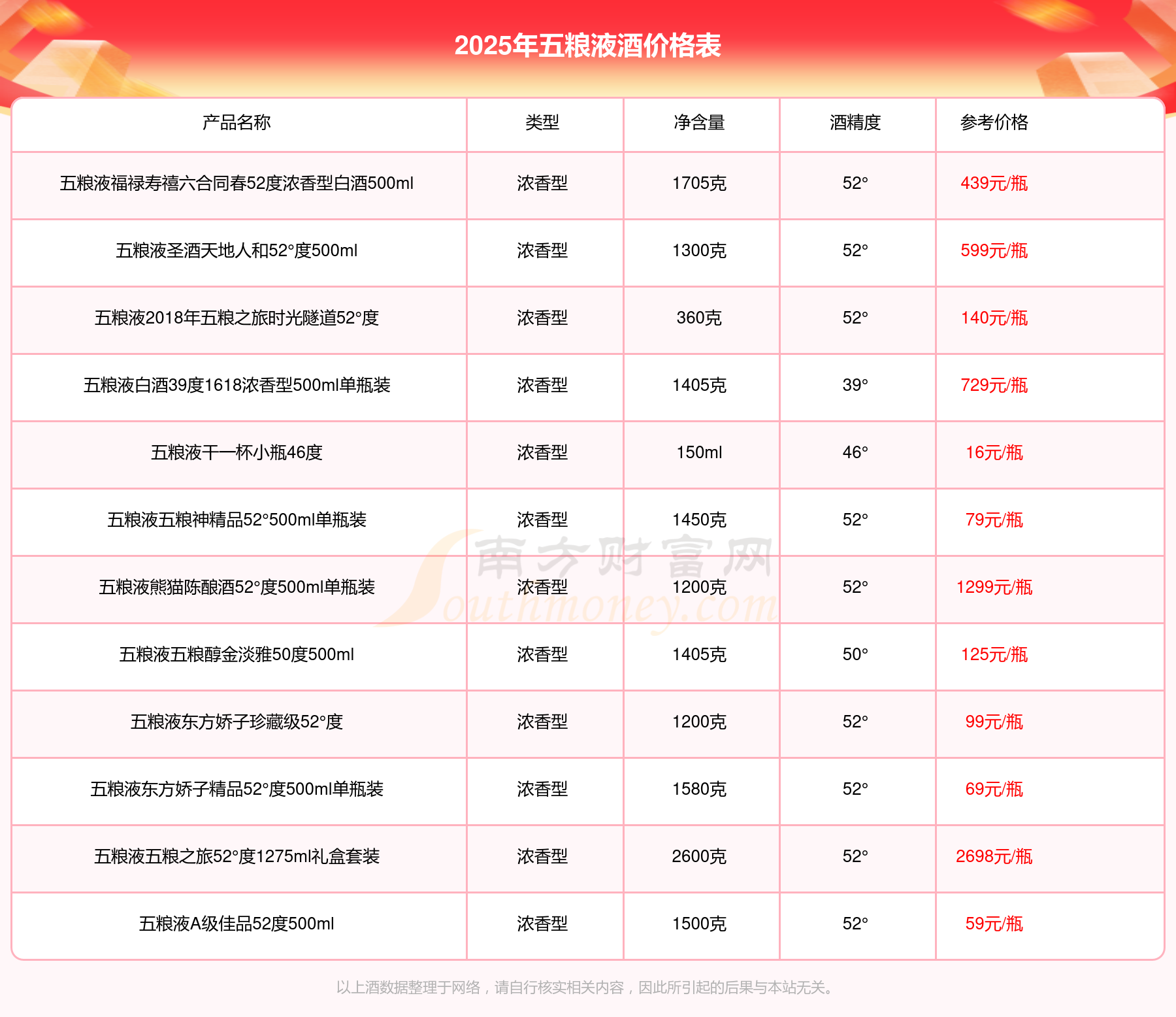 2025年五糧液價(jià)格最高的酒是五糧液百年世博世紀(jì)榮耀紀(jì)念酒60°999ml,參考價(jià)26980元/瓶,最低的是五糧液干一杯小瓶46度,參考價(jià)16元/瓶,價(jià)格高低差為26964元/瓶。