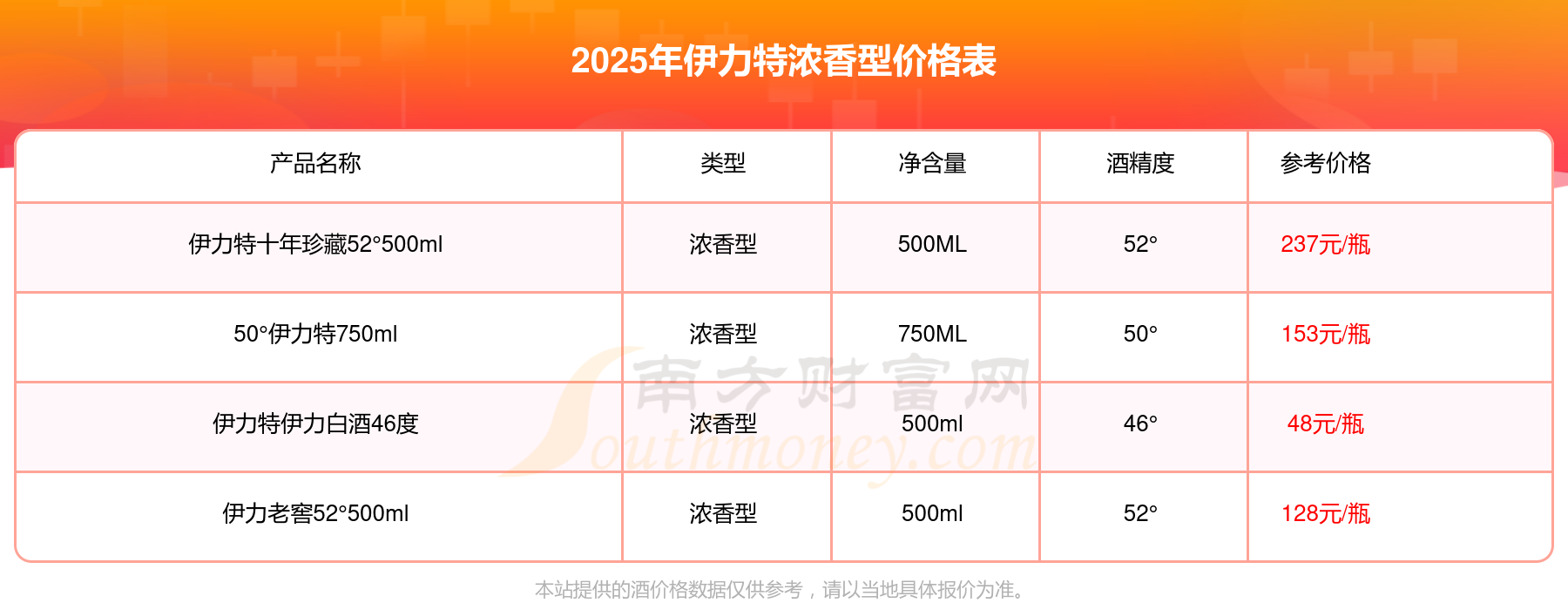 2025年伊力特濃香型酒伊力特十年珍藏52°500ml、50°伊力特750ml、伊力老窖52°500ml、伊力特伊力白酒46度等最新價格如下: