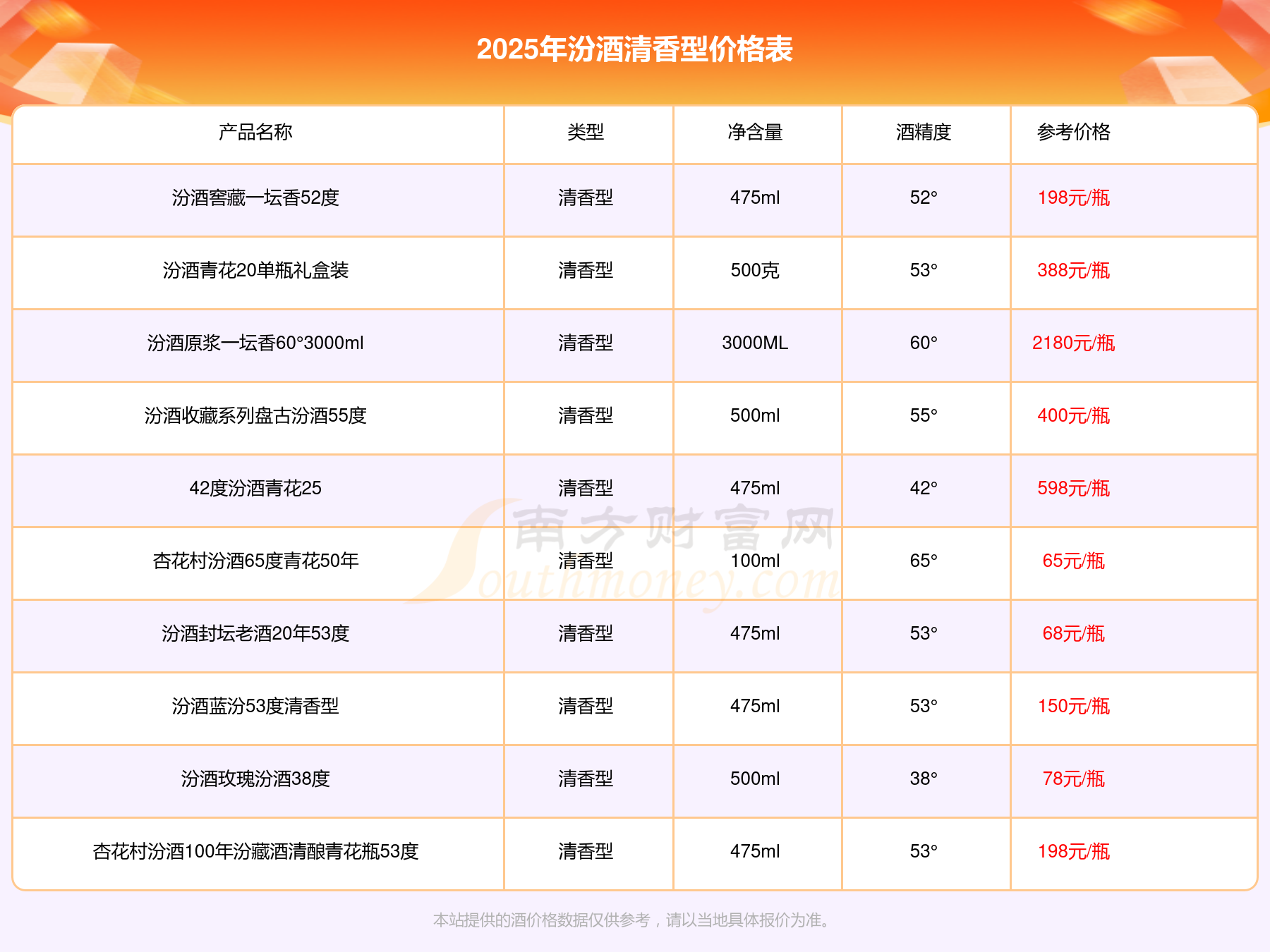 2025年,汾酒清香型酒價格最高的是汾酒原漿一壇香60°3000ml,參考價2180元,最低的是汾酒百年汾杏酒純釀53度,參考價28元,價格高低差為2152元。