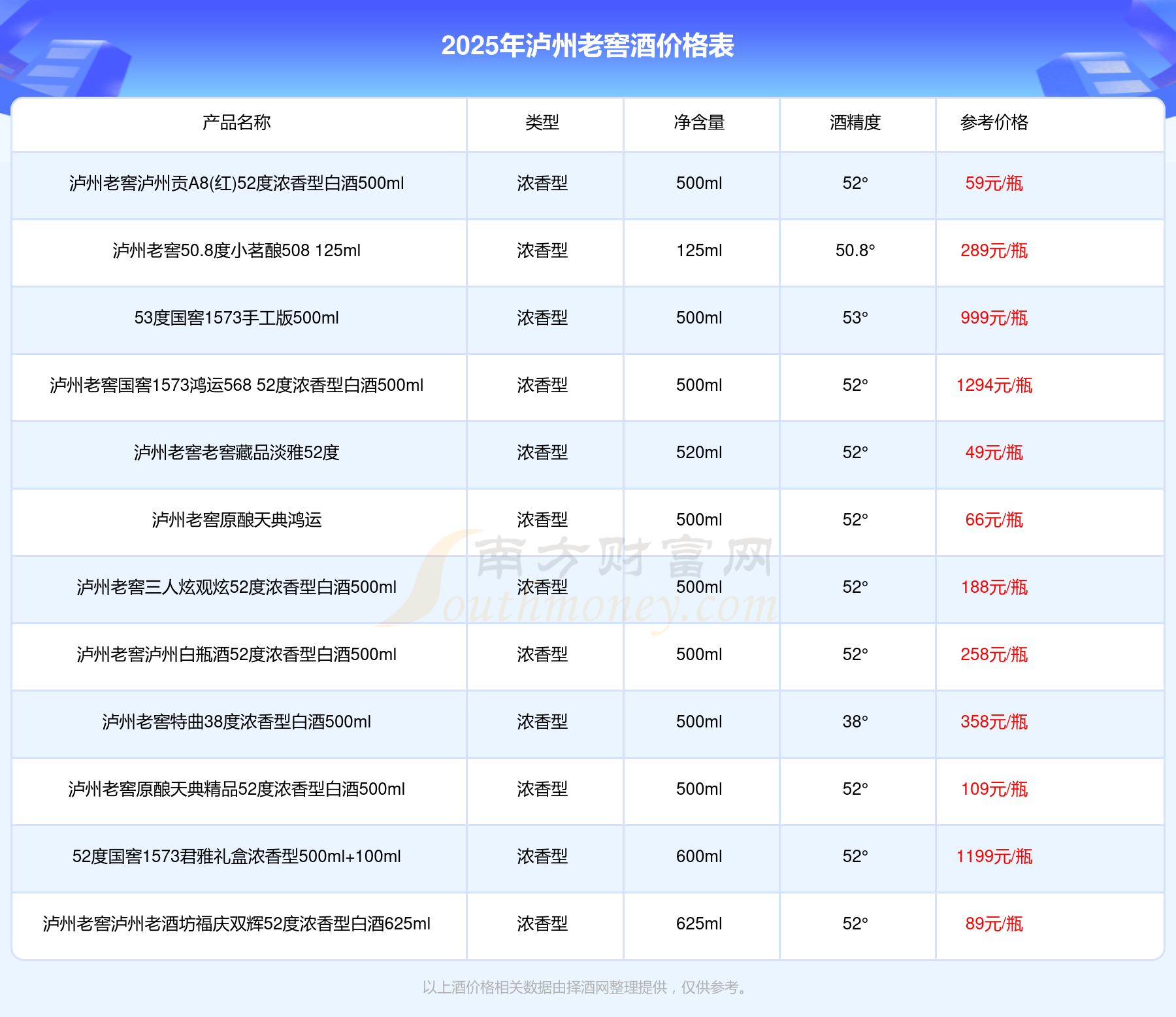 2025年瀘州老窖酒瀘州老窖國窖1573春釀鼠兆豐年E 55度、瀘州老窖國窖1573生命中的那壇酒55度014、瀘州老窖國窖1573春釀鼠兆豐年A 55度、瀘州老窖國窖1573生命中的那壇酒55度013濃香型白酒1000ml、瀘州老窖國窖1573生命中的那壇酒55度009 1000ml等最新價格如下: