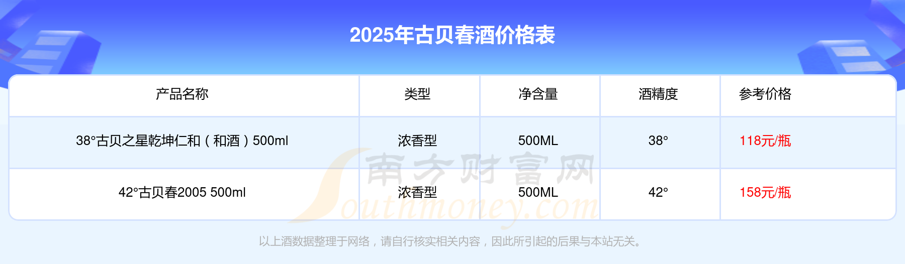 2025古貝春酒最新價(jià)格:42°古貝春2005 500ml參考價(jià)158元/瓶、38°古貝之星乾坤仁和(和酒)500ml參考價(jià)118元/瓶。