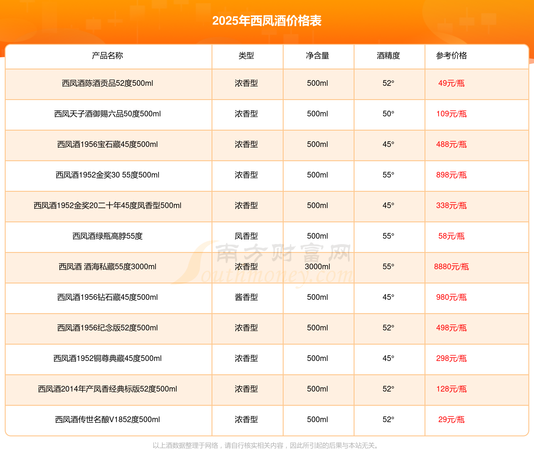 2025年,西鳳酒 酒海私藏55度3000ml、西鳳酒1952金獎50 55度500ml、西鳳酒2013年產(chǎn)老酒鳳香經(jīng)典30年52度500ml、西鳳酒1956鉆石藏45度500ml、西鳳酒1952金獎30 55度500ml等西鳳酒價格如下:西鳳酒 酒海私藏55度3000ml參考價8880元/瓶、西鳳酒1952金獎50 55度500ml參考價2380元/瓶、西鳳酒2013年產(chǎn)老酒鳳香經(jīng)典30年52度500ml參考價1280元/瓶、西鳳酒1956鉆石藏45度500ml參考價980元/瓶、西鳳酒1952金獎30 55度500ml參考價898元/瓶。