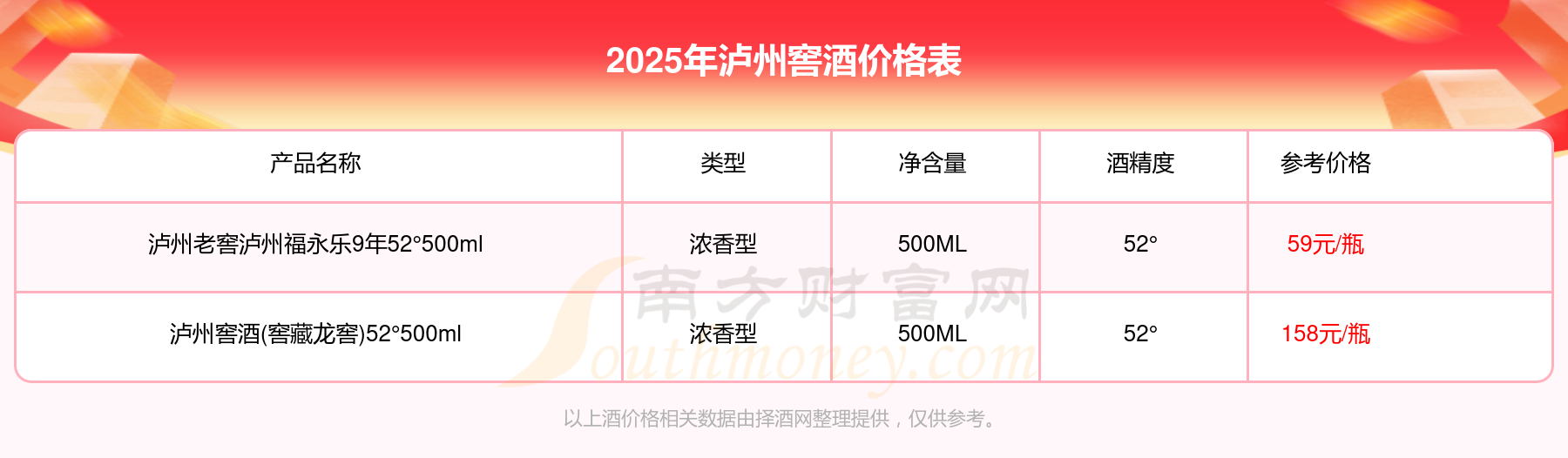 瀘州窖酒(窖藏龍窖)52°500ml參考價(jià)158元/瓶、瀘州老窖瀘州福永樂9年52°500ml參考價(jià)59元/瓶。