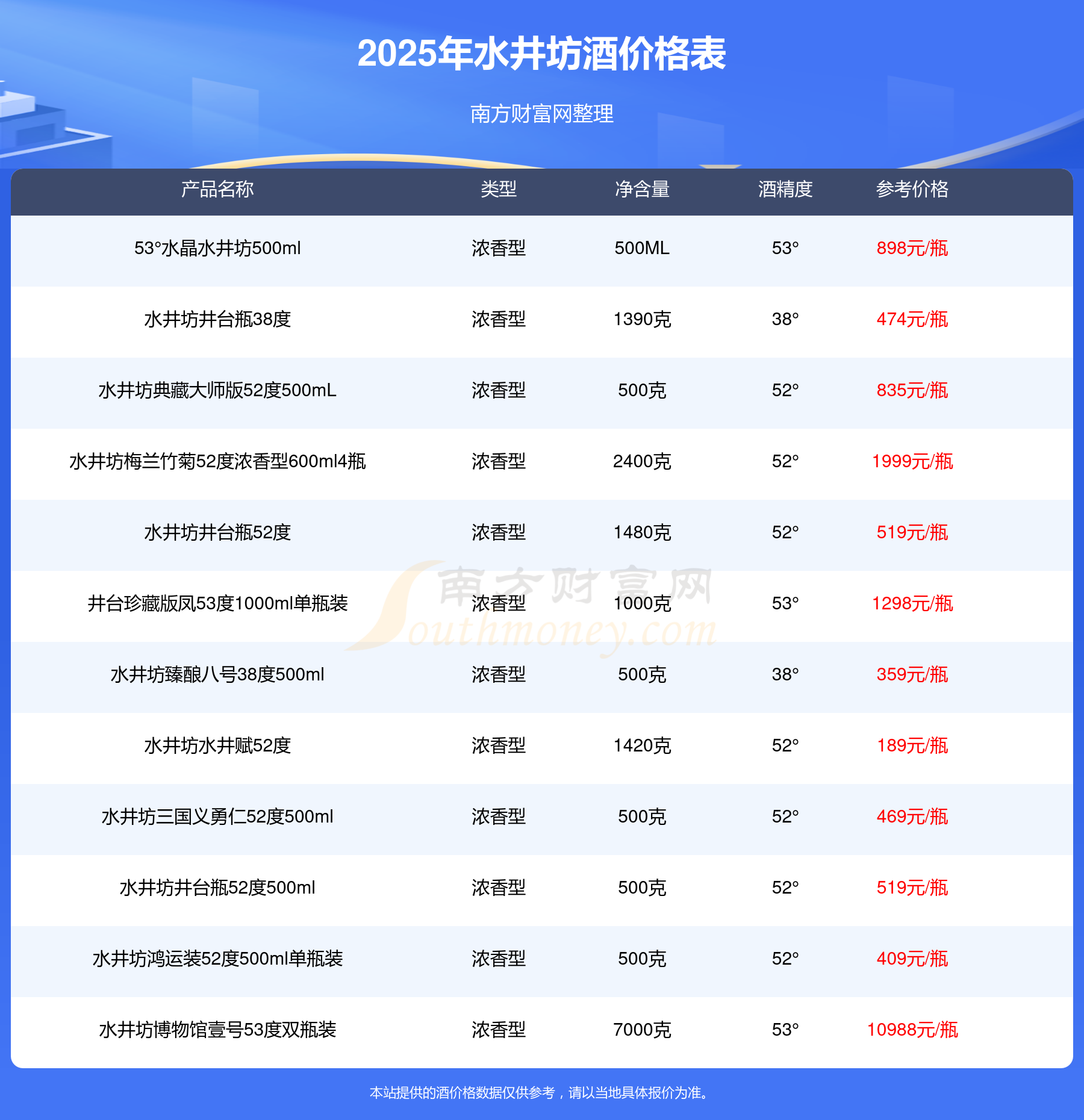 2025年水井坊酒水井坊大壇收藏級(jí)原漿天球瓶66度、水井坊博物館壹號(hào)53度雙瓶裝、53°水井坊公元十三600ml、水井坊梅蘭竹菊52度濃香型600ml4瓶、水井坊菁翠52度500ml、井臺(tái)珍藏版龍53度1000ml單瓶裝等最新價(jià)格如下: