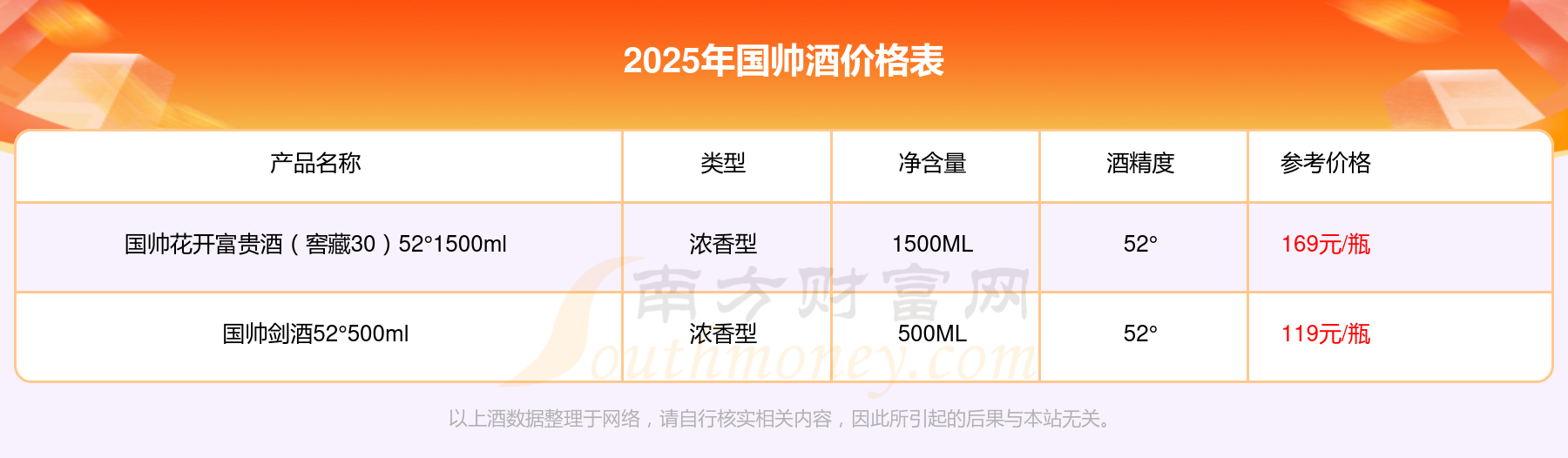 2025年,國帥花開富貴酒(窖藏30)52°1500ml、國帥劍酒52°500ml等國帥酒價(jià)格如下:國帥花開富貴酒(窖藏30)52°1500ml參考價(jià)169元/瓶、國帥劍酒52°500ml參考價(jià)119元/瓶。