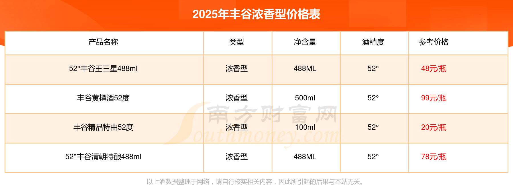 豐谷濃香型酒最新價格2025:豐谷黃樽酒52度參考價99元/瓶、52°豐谷清朝特釀488ml參考價78元/瓶、52°豐谷王三星488ml參考價48元/瓶、豐谷精品特曲52度參考價20元/瓶。