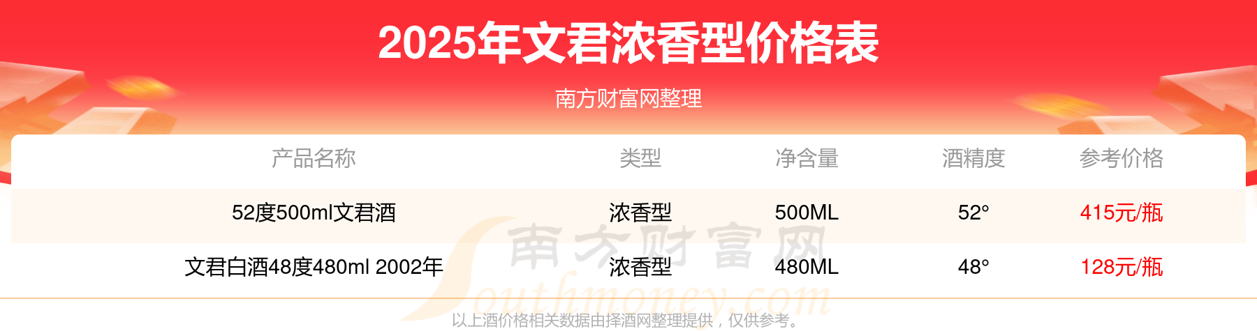2025年文君濃香型價格最高的酒是52度500ml文君酒,參考價415元/瓶,最低的是文君白酒48度480ml 2002年,參考價128元/瓶,價格高低差為287元/瓶。
