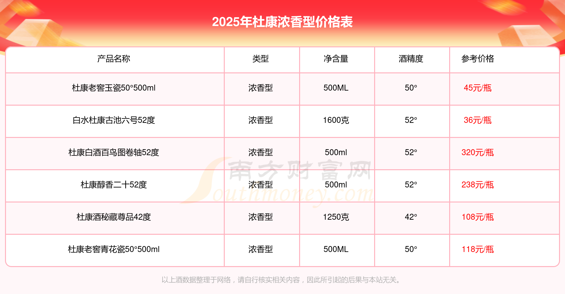 杜康白酒百鳥圖卷軸52度參考價320元/瓶、杜康醇香二十52度參考價238元/瓶、杜康老窖青花瓷50°500ml參考價118元/瓶、杜康酒秘藏尊品42度參考價108元/瓶、杜康老窖玉瓷50°500ml參考價45元/瓶、白水杜康古池六號52度參考價36元/瓶。