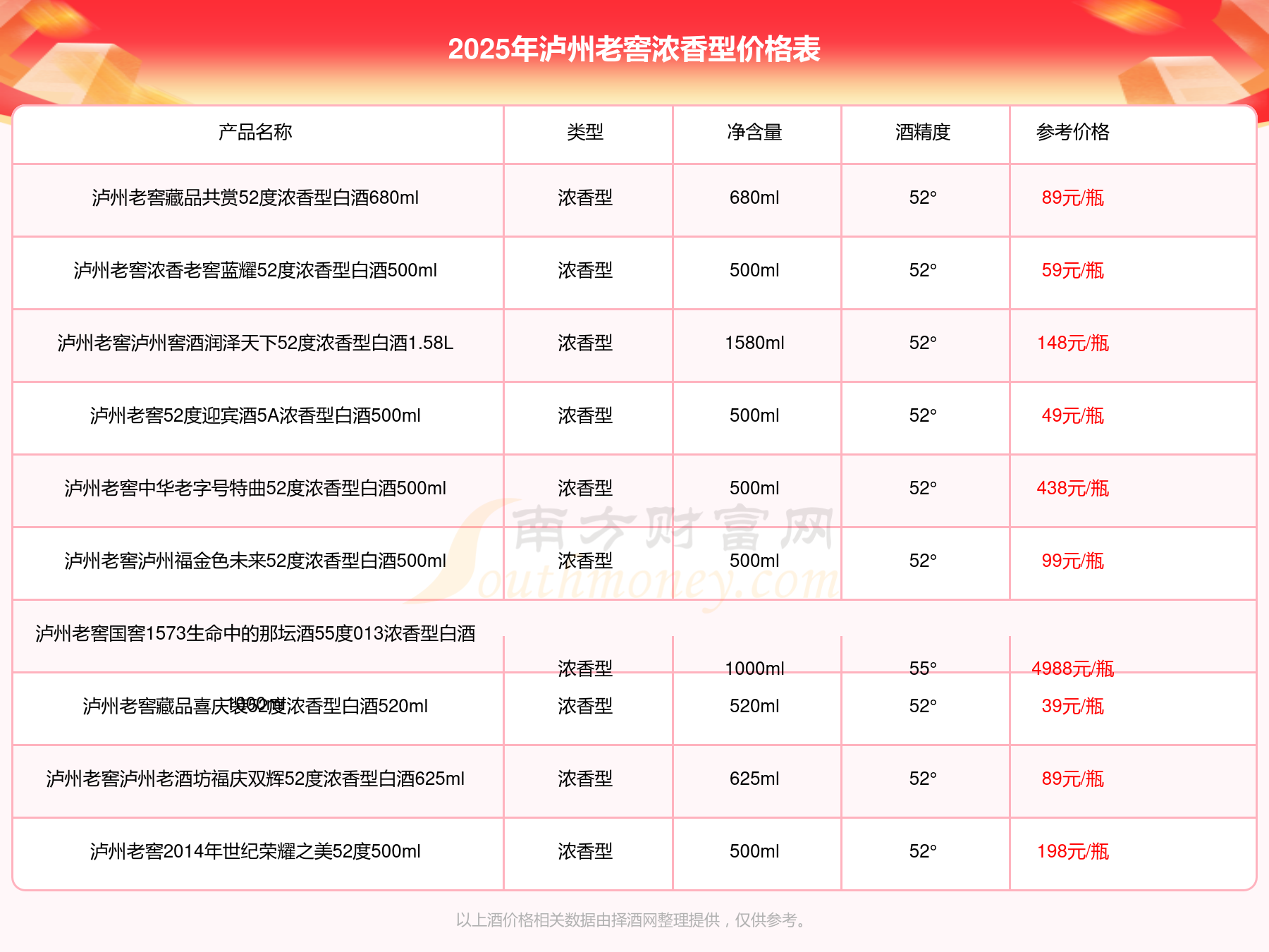 2025年,瀘州老窖國窖1573春釀鼠兆豐年E 55度、瀘州老窖國窖1573生命中的那壇酒55度014、瀘州老窖國窖1573春釀鼠兆豐年A 55度、瀘州老窖國窖1573生命中的那壇酒55度013濃香型白酒1000ml、瀘州老窖國窖1573生命中的那壇酒55度009 1000ml、瀘州老窖國窖1573中國品味52度濃香型白酒500ml、瀘州老窖國窖1573許燎源概念作品58度濃香型白酒1000ml、瀘州老窖52度國窖1573狗年生肖禮盒等瀘州老窖濃香型酒價格如下:瀘州老窖國窖1573春釀鼠兆豐年E 55度參考價17999元/瓶、瀘州老窖國窖1573生命中的那壇酒55度014參考價9999元/瓶、瀘州老窖國窖1573春釀鼠兆豐年A 55度參考價5088元/瓶、瀘州老窖國窖1573生命中的那壇酒55度013濃香型白酒1000ml參考價4988元/瓶、瀘州老窖國窖1573生命中的那壇酒55度009 1000ml參考價4288元/瓶、瀘州老窖國窖1573中國品味52度濃香型白酒500ml參考價2888元/瓶、瀘州老窖國窖1573許燎源概念作品58度濃香型白酒1000ml參考價2680元/瓶、瀘州老窖52度國窖1573狗年生肖禮盒參考價2143元/瓶。