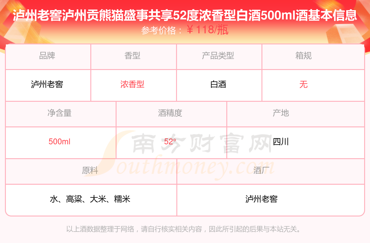 瀘州老窖瀘州貢熊貓盛事共享52度濃香型白酒500ml基本信息