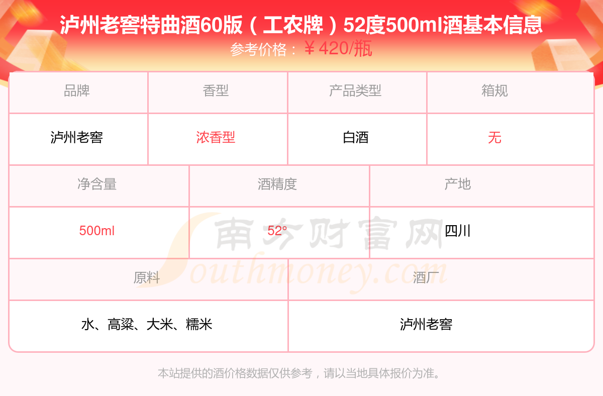 瀘州老窖特曲酒60版(工農(nóng)牌)52度500ml基本信息