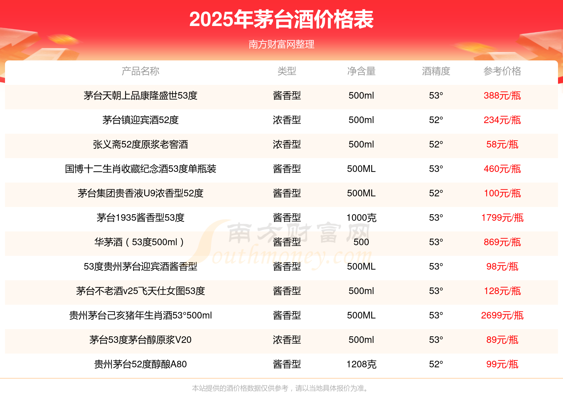 茅臺酒最新價格2025:華茅鑒藏 醬香型白酒 3L 53°參考價8388元/瓶、53度五星茅臺生肖酒丁酉雞年參考價2798元/瓶、貴州茅臺己亥豬年生肖酒53°500ml參考價2699元/瓶、53度五星茅臺生肖酒戊戌狗年參考價2698元/瓶、飛天茅臺53°500ml(2015年)參考價2199元/瓶、茅臺王子酒己亥豬年生肖紀念酒53度2.5L參考價2099元/瓶、茅臺1935醬香型53度參考價1799元/瓶。