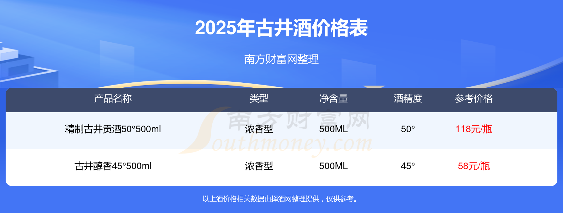 2025年,精制古井貢酒50°500ml、古井醇香45°500ml等古井酒價(jià)格如下:
