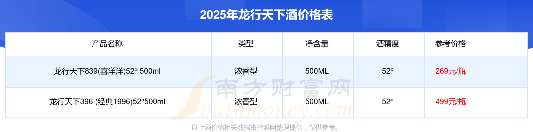 龍行天下396 (經(jīng)典1996)52°500ml參考價499元/瓶、龍行天下839(喜洋洋)52° 500ml參考價269元/瓶。