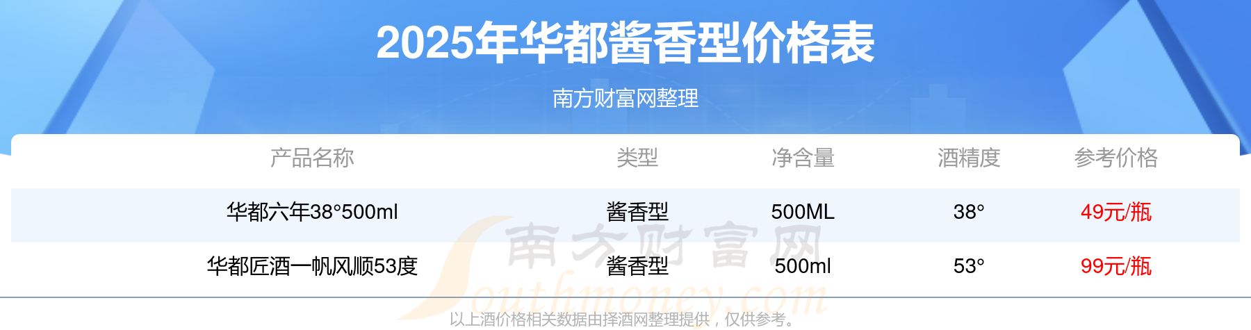 華都匠酒一帆風順53度參考價99元/瓶、華都六年38°500ml參考價49元/瓶。