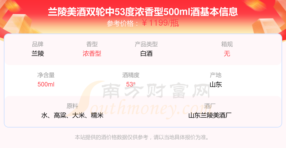 蘭陵美酒雙輪中53度濃香型500ml基本信息
