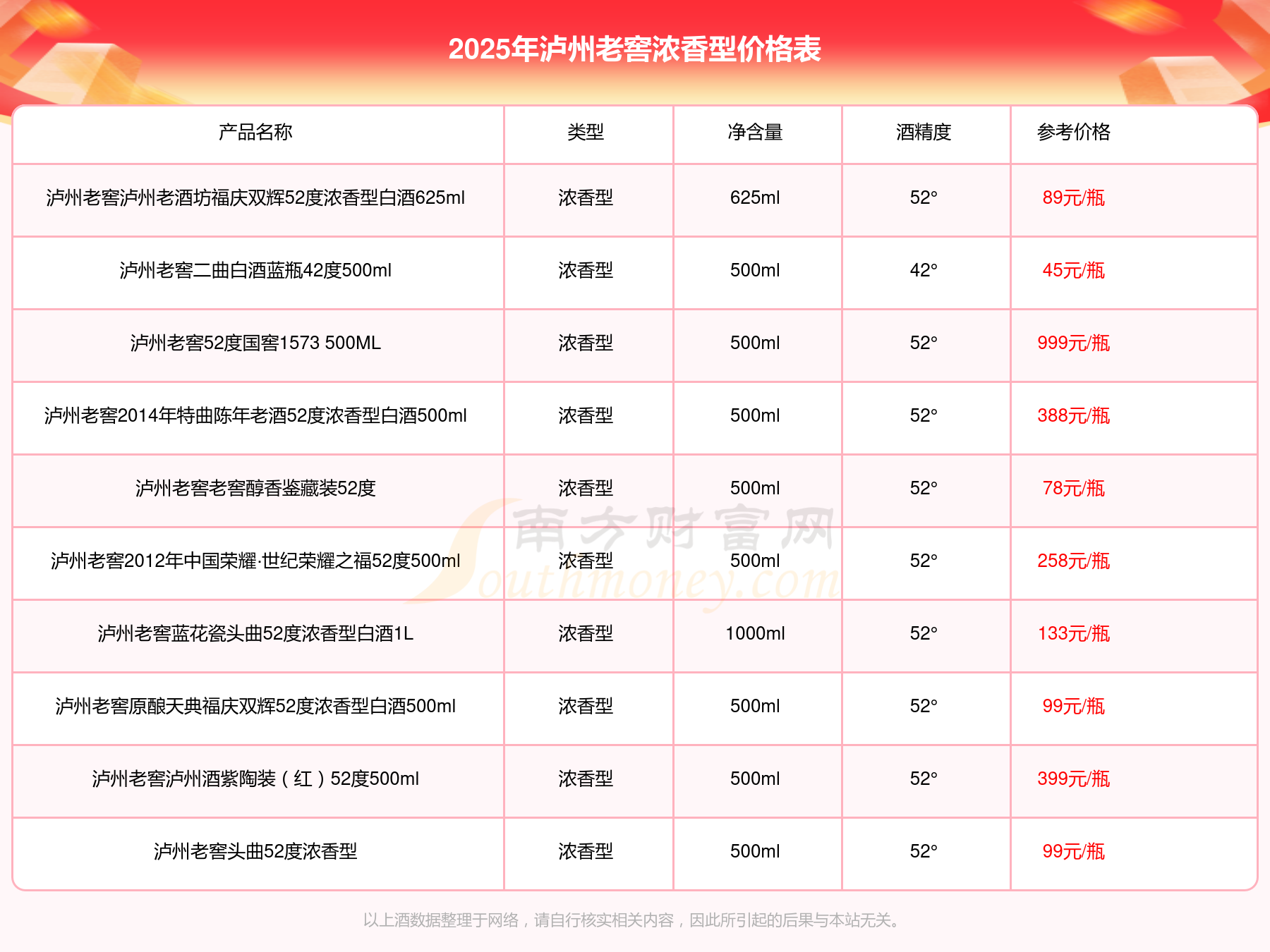 2025瀘州老窖濃香型酒最新價格:瀘州老窖國窖1573春釀鼠兆豐年E 55度參考價17999元/瓶、瀘州老窖國窖1573生命中的那壇酒55度014參考價9999元/瓶、瀘州老窖國窖1573春釀鼠兆豐年A 55度參考價5088元/瓶、瀘州老窖國窖1573生命中的那壇酒55度013濃香型白酒1000ml參考價4988元/瓶。