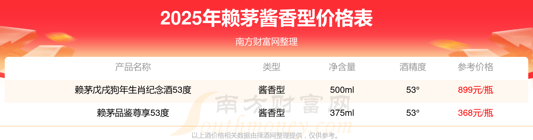 2025年賴茅醬香型酒賴茅戊戌狗年生肖紀(jì)念酒53度、賴茅品鑒尊享53度等最新價格如下: