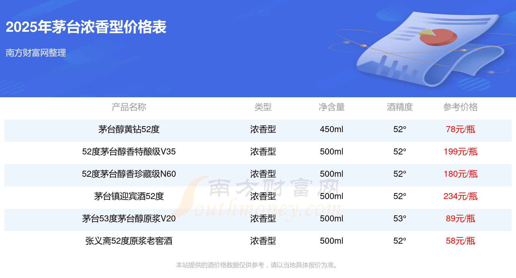 2025年茅臺(tái)濃香型酒茅臺(tái)鎮(zhèn)迎賓酒52度、52度茅臺(tái)醇香特釀級(jí)V35、52度茅臺(tái)醇香珍藏級(jí)N60、茅臺(tái)53度茅臺(tái)醇原漿V20、茅臺(tái)醇黃鉆52度、張義齋52度原漿老窖酒等最新價(jià)格如下:茅臺(tái)鎮(zhèn)迎賓酒52度參考價(jià)234元/瓶、52度茅臺(tái)醇香特釀級(jí)V35參考價(jià)199元/瓶、52度茅臺(tái)醇香珍藏級(jí)N60參考價(jià)180元/瓶、茅臺(tái)53度茅臺(tái)醇原漿V20參考價(jià)89元/瓶、茅臺(tái)醇黃鉆52度參考價(jià)78元/瓶、張義齋52度原漿老窖酒參考價(jià)58元/瓶。