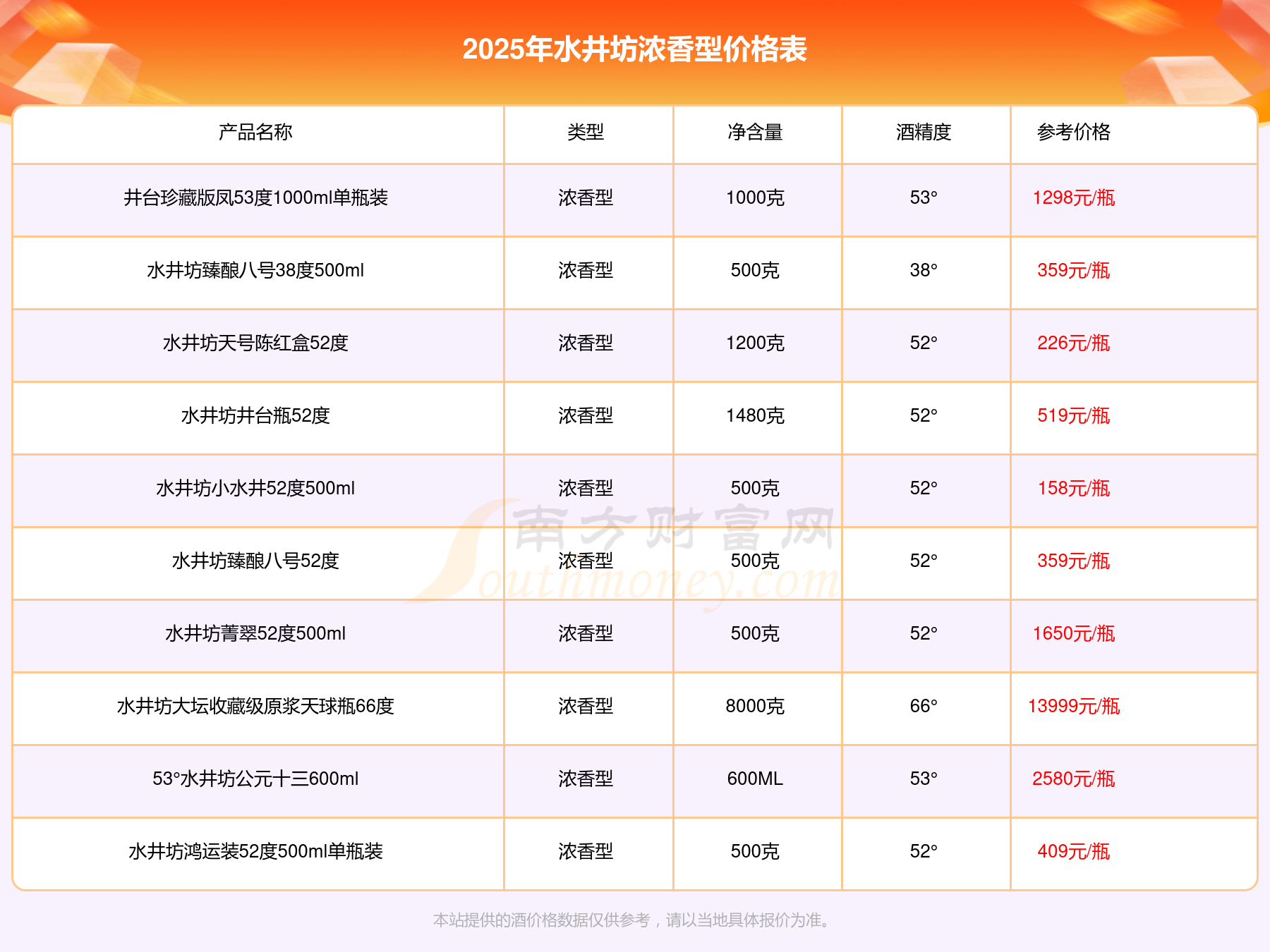 2025年,水井坊濃香型酒價格最高的是水井坊大壇收藏級原漿天球瓶66度,參考價13999元,最低的是水井坊小水井52度500ml,參考價158元,價格高低差為13841元。