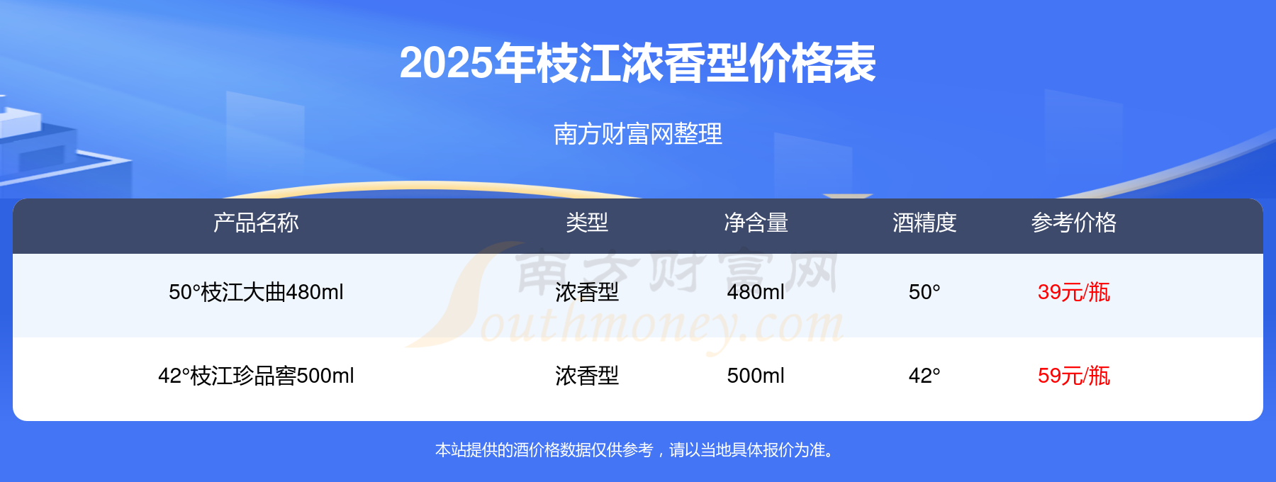42°枝江珍品窖500ml參考價(jià)59元/瓶、50°枝江大曲480ml參考價(jià)39元/瓶。