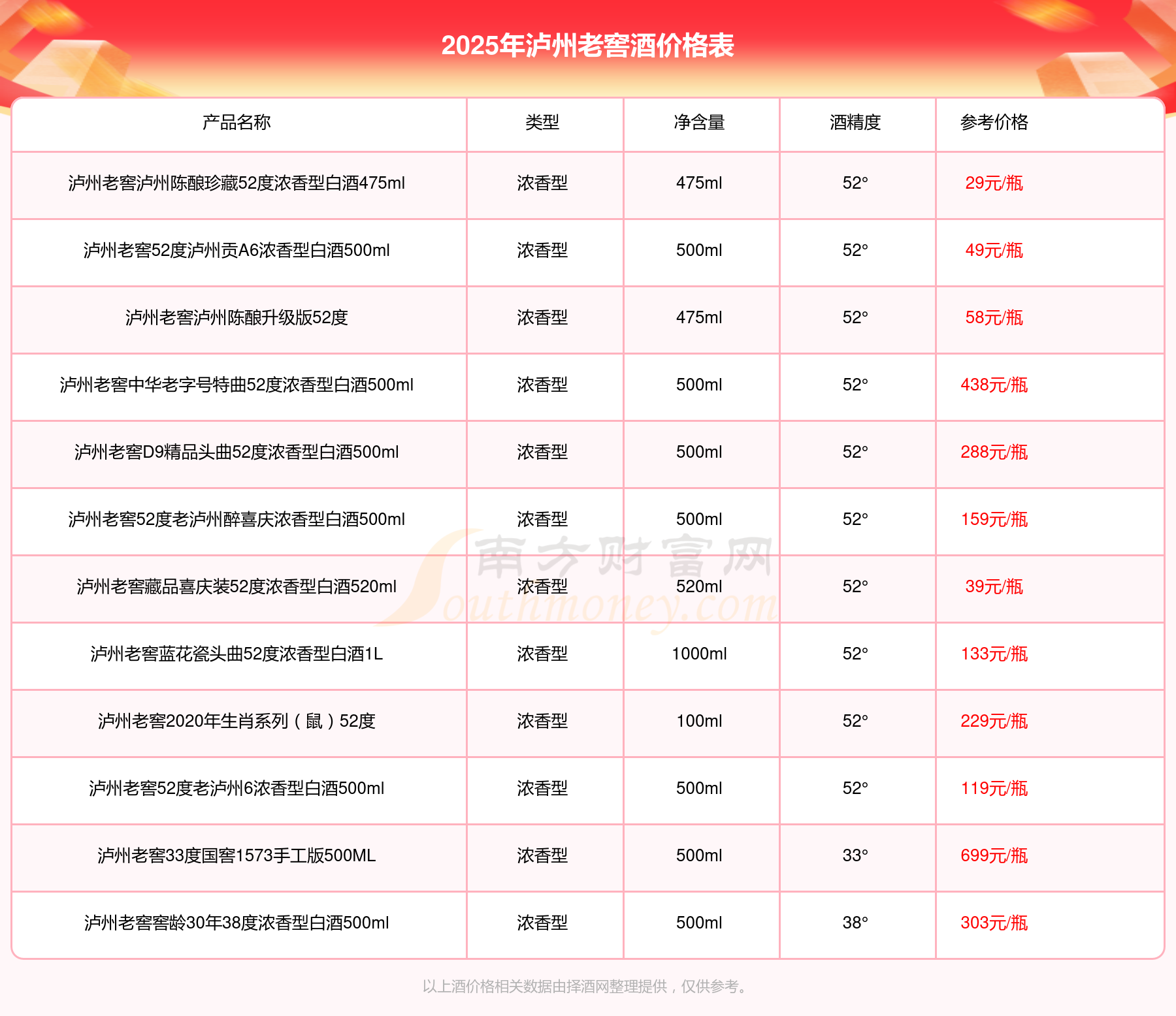 2025年,瀘州老窖國窖1573春釀鼠兆豐年E 55度、瀘州老窖國窖1573生命中的那壇酒55度014、瀘州老窖國窖1573春釀鼠兆豐年A 55度、瀘州老窖國窖1573生命中的那壇酒55度013濃香型白酒1000ml、瀘州老窖國窖1573生命中的那壇酒55度009 1000ml等瀘州老窖酒價(jià)格如下:瀘州老窖國窖1573春釀鼠兆豐年E 55度參考價(jià)17999元/瓶、瀘州老窖國窖1573生命中的那壇酒55度014參考價(jià)9999元/瓶、瀘州老窖國窖1573春釀鼠兆豐年A 55度參考價(jià)5088元/瓶、瀘州老窖國窖1573生命中的那壇酒55度013濃香型白酒1000ml參考價(jià)4988元/瓶、瀘州老窖國窖1573生命中的那壇酒55度009 1000ml參考價(jià)4288元/瓶。
