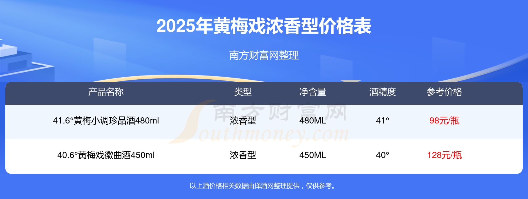 2025年黃梅戲濃香型酒40.6°黃梅戲徽曲酒450ml、41.6°黃梅小調珍品酒480ml等最新價格如下:40.6°黃梅戲徽曲酒450ml參考價128元/瓶、41.6°黃梅小調珍品酒480ml參考價98元/瓶。