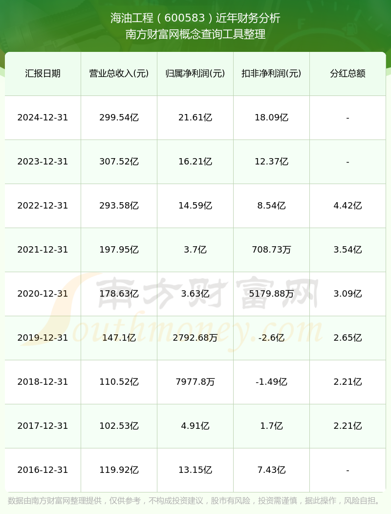 2024年報(bào)顯示,海油工程實(shí)現(xiàn)營收299.54億,同比增長-2.59%;凈利潤21.61億,同比增長33.38%;毛利率12.28%。