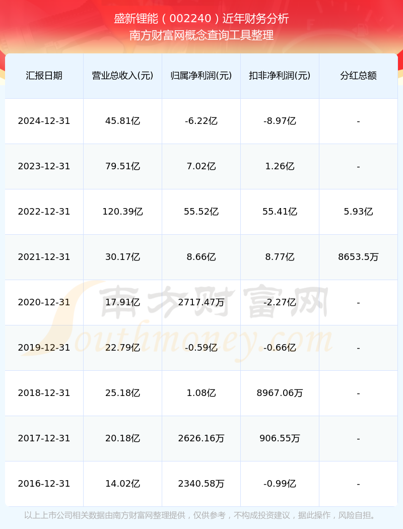 盛新鋰能2024年總營收45.81億,同比增長-42.38%;凈利潤-6.22億,同比增長-188.51%;銷售毛利率2.42%。