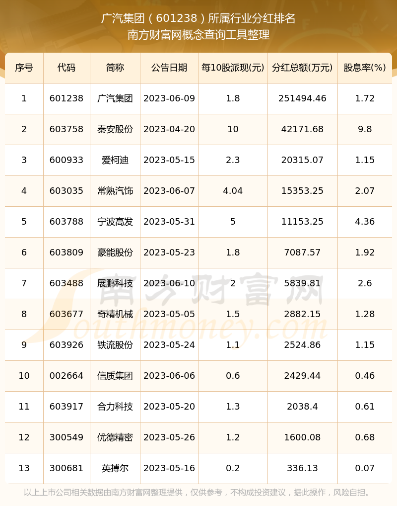 按照南方財富網(wǎng)趨勢選股系統(tǒng)統(tǒng)計,廣汽集團所屬行業(yè)為汽車整車行業(yè),汽車整車行業(yè)分紅排名情況如下表: