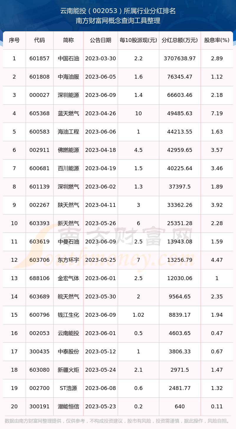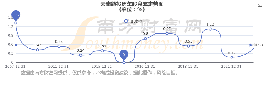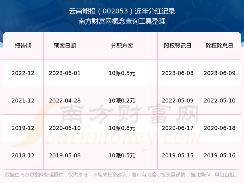 云南能投最新一次公布的分紅方案為10派0.5元。本次權(quán)益分派股權(quán)登記日為2023年6月8日,除權(quán)除息日為2023年6月9日,派息日為2023年6月9日。
