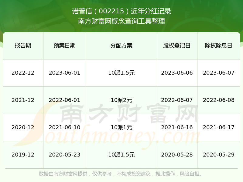 諾普信最新一次公布的分紅方案為10派1.5元。本次權(quán)益分派股權(quán)登記日為2023年6月6日,除權(quán)除息日為2023年6月7日,派息日為2023年6月7日。