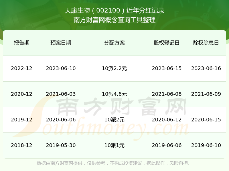 天康生物最新一次公布的分紅方案為10派2.2元。本次權(quán)益分派股權(quán)登記日為2023年6月15日,除權(quán)除息日為2023年6月16日,派息日為2023年6月16日。