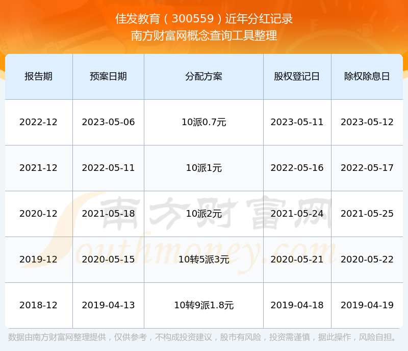佳發(fā)教育最新一次公布的分紅方案:10派0.7元。