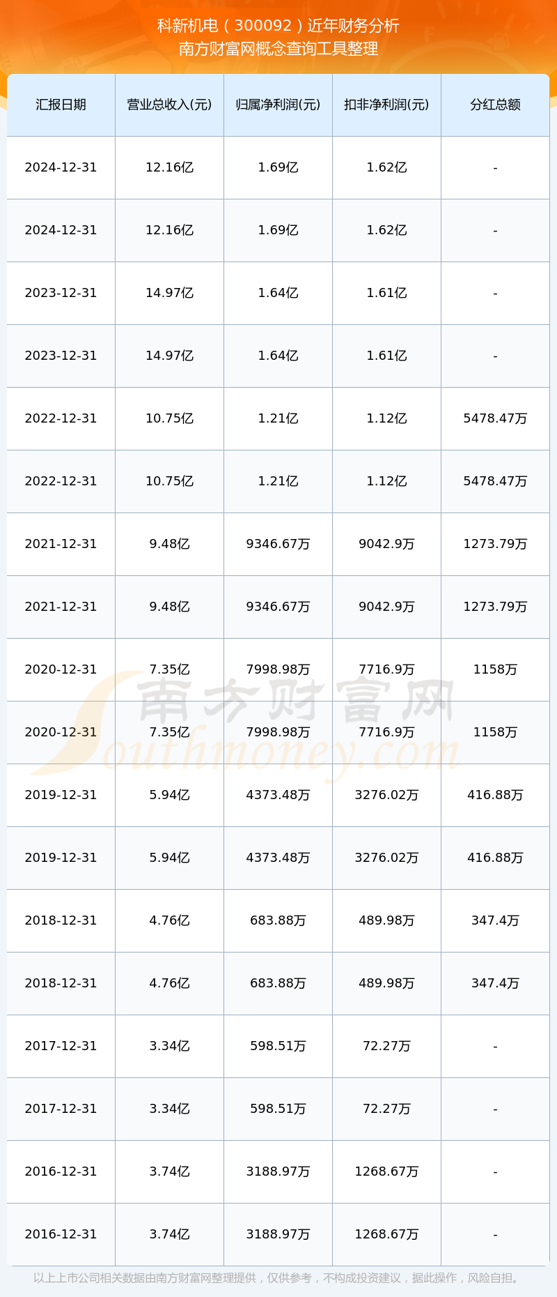 科新機電2024年總營收12.16億,同比增長-18.79%;凈利潤1.69億,同比增長3.54%;銷售毛利率27.85%。