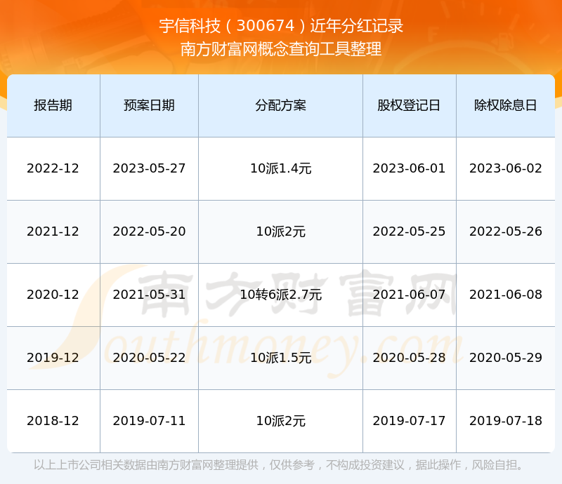 宇信科技最新一次公布的分紅方案為10派1.4元。本次權(quán)益分派股權(quán)登記日為2023年6月1日,除權(quán)除息日為2023年6月2日,派息日為2023年6月2日。