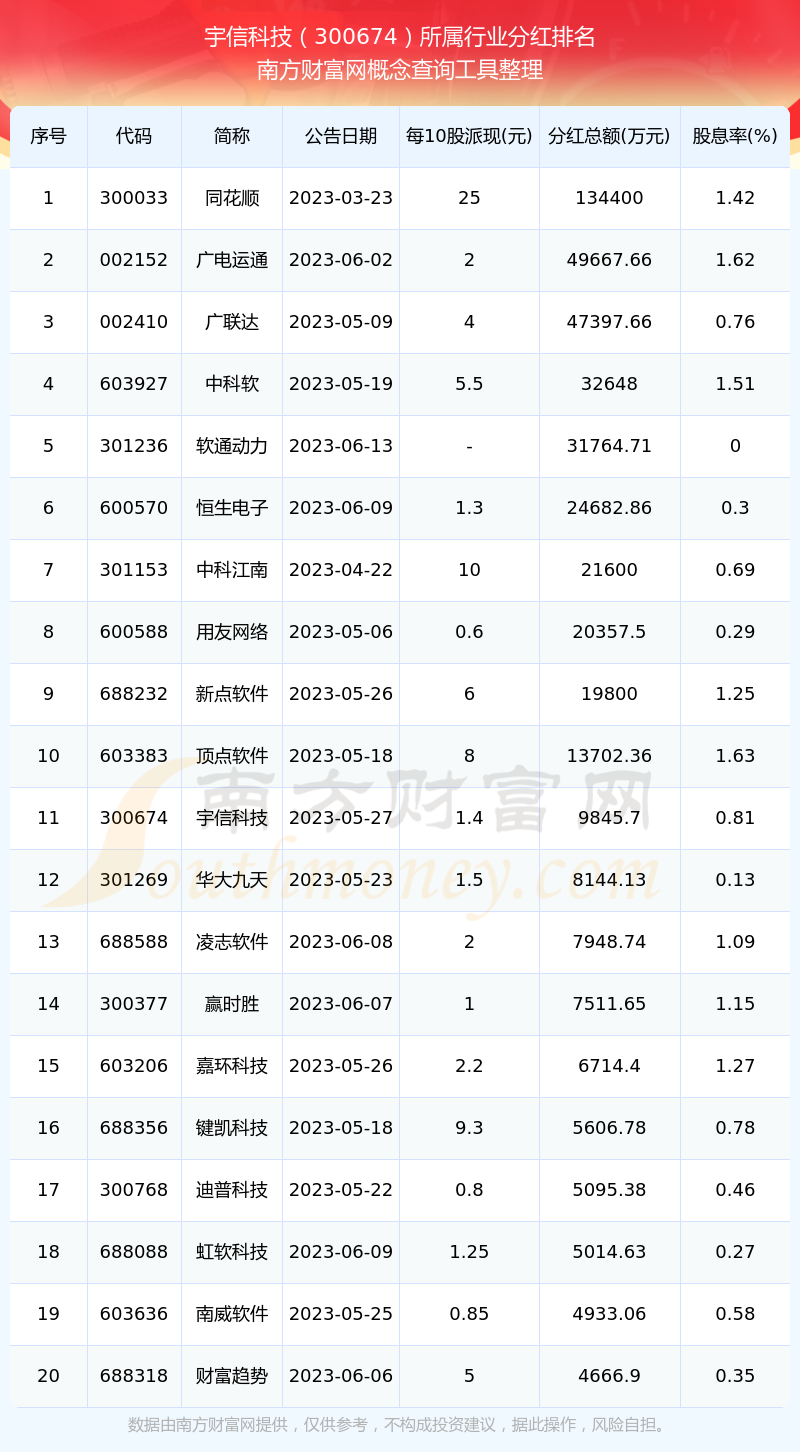按照南方財富網(wǎng)趨勢選股系統(tǒng)統(tǒng)計,宇信科技所屬行業(yè)為軟件開發(fā)行業(yè),軟件開發(fā)行業(yè)分紅排名情況如下表: