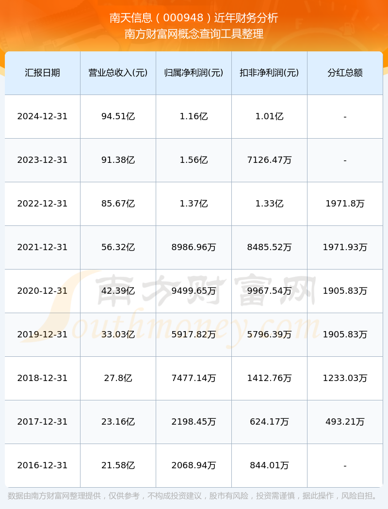 南天信息公司2024年實現(xiàn)營業(yè)收入94.51億元,同比增長3.43%;凈利潤1.16億元,同比增長-25.78%;毛利率12.94%。