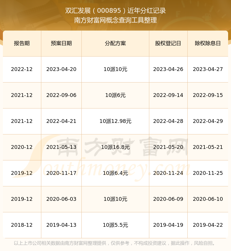 雙匯發(fā)展最新一次公布的分紅方案為10派10元。本次權(quán)益分派股權(quán)登記日為2023年4月26日,除權(quán)除息日為2023年4月27日,派息日為2023年4月27日。