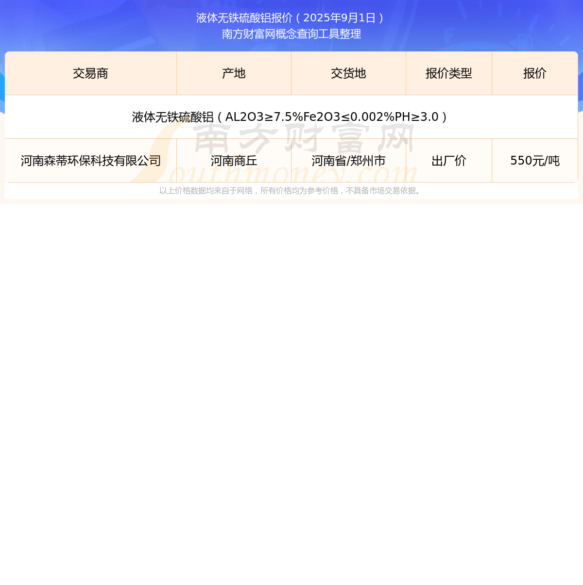 2025年9月1日,河南森蒂環(huán)保科技有限公司液體無鐵硫酸鋁(AL2O3≥7.5%Fe2O3≤0.002%PH≥3.0),河南商丘,交易地點為河南省/鄭州市,報價為550.00元/噸。